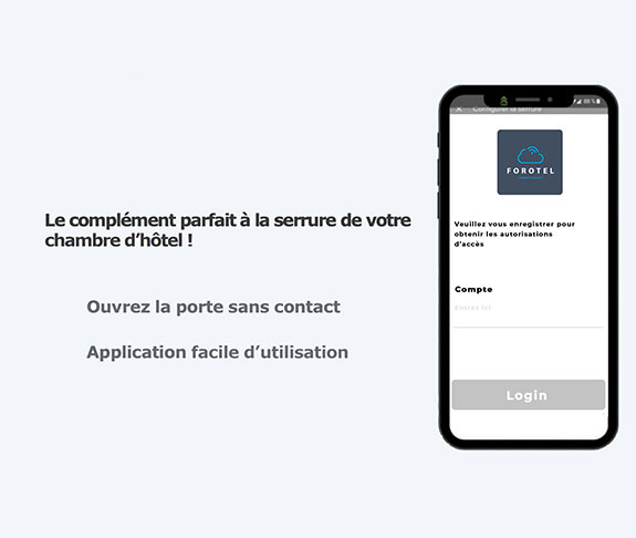 • Cette application mobile est destinée au client de l’hôtel, ce dernier peut recevoir l’accès à sa chambre avant même son arrivée à l’hôtel, dès que sa réservation confirmée, le responsable peut l’enregistrer dans le software soit avec un numéro de téléphone ou une adresse email et envoyer une notification à son client par sms ou email, par la suite le client lui suffira de télécharger l’application Forotel Guest sur App Store pour les utilisateurs de IOS ou Play Store pour les utilisateurs Android et il aura son accès mentionnant le numéro de la chambre.